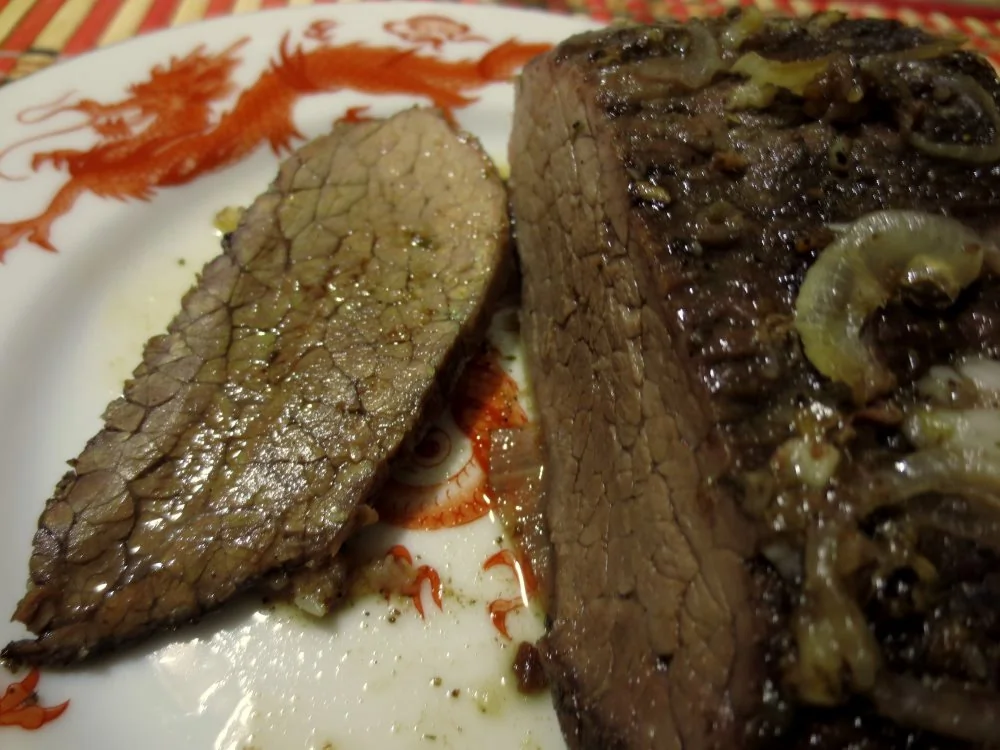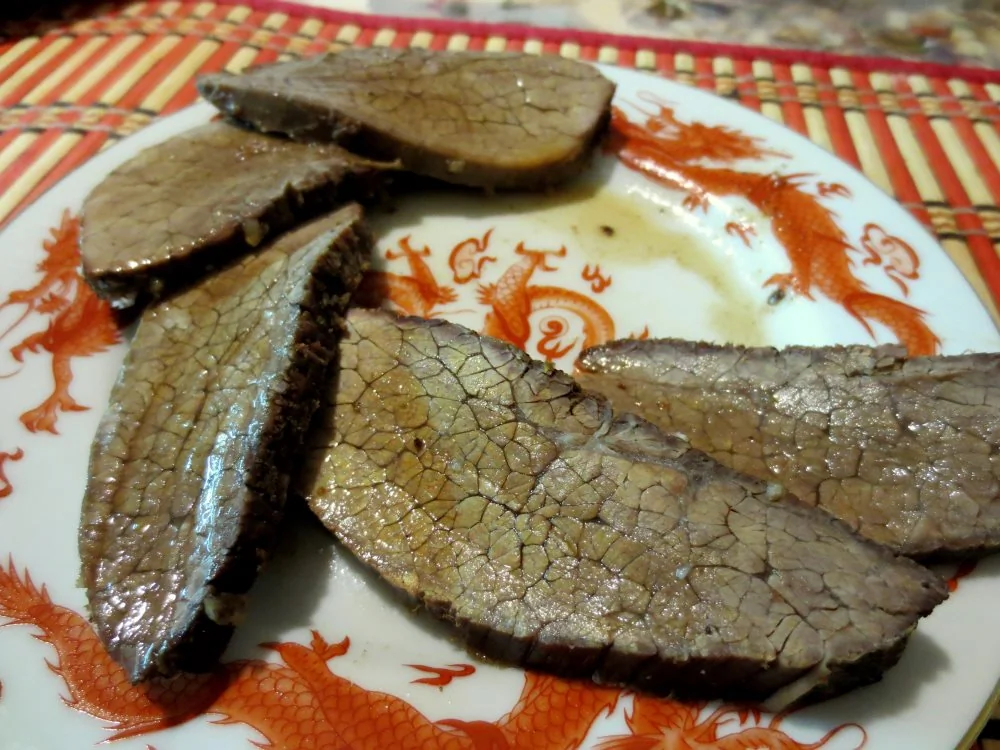 ШАГ 5 Дать мясу остыть (духовке) и подавать холодным. Удобно сразу нарезать мясо на порционные куски и полить оставшейся на противне жидкостью.