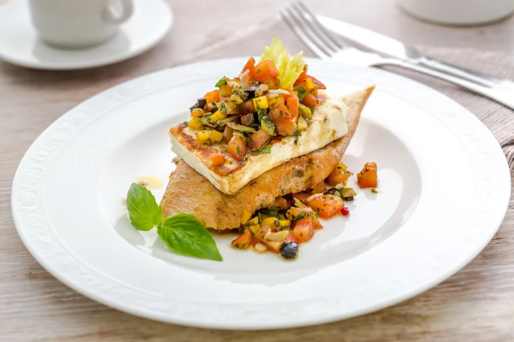 Жареная брынза на деревенском хлебе с сальсой из томатов и острого перца