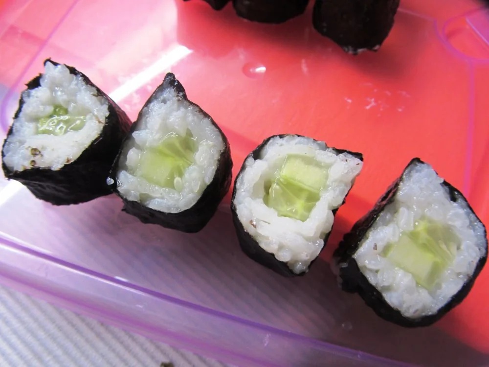 ШАГ 9 Приготовим суши, когда водоросли внутри. Кладем лист нори на циновку. Смачиваем руки водой. Укладываем рис. Полностью закрываем водоросли рисом. Посыпаем кунжутом. Переворачиваем лист рисом вниз. Раскладываем огурец почти посередине риса — чуть ближе к себе. И повторяем технологию формирования суши. Снимаем с циновки, делим напополам. Смачиваем нож и пилящими движениями режем два рулетика одновременно на три части. Края срезаем.