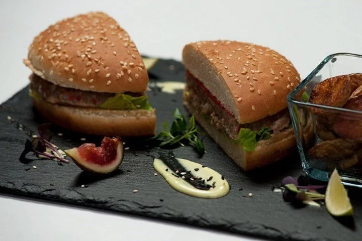 ШАГ 6 Украсить блюдо кресс-салатом, кунжутом, инжиром и долькой лайма. Подавать бургер с картофелем и васаби-майонезом.
