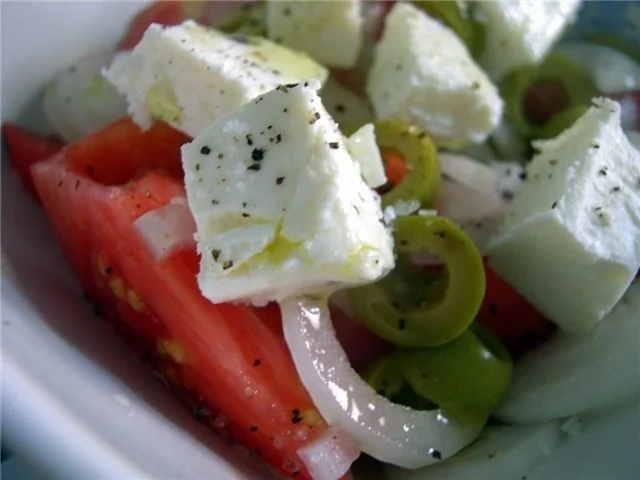 ШАГ 1 Нарезать помидоры тонкими дольками. Нарезать лук полукольцами. Нарезать оливки пополам. Нарезать сыр фета маленькими кубиками.