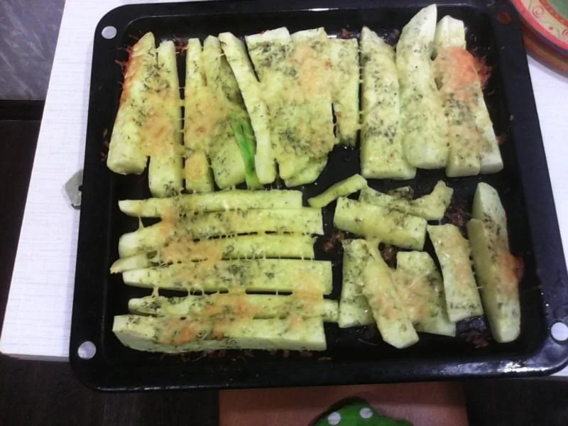 ШАГ 1 Разрезать кабачки вдоль и выложить на противень. Посыпать смесью трав, посолить, посыпать тертым сыром.