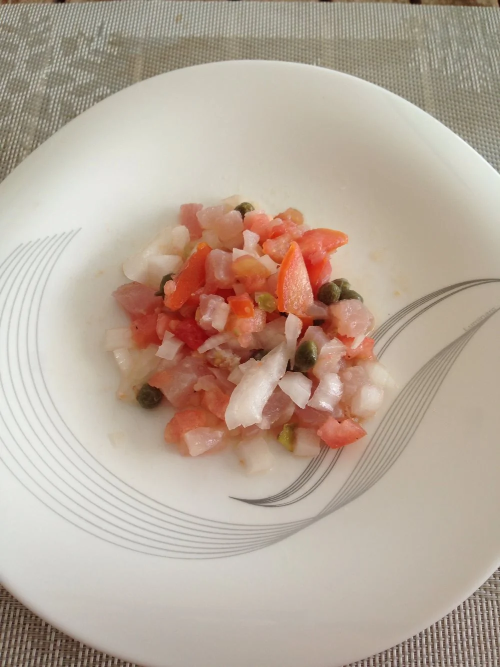 ШАГ 1 Порубите мелкими кубиками мясо тунца, помидоры, лук.