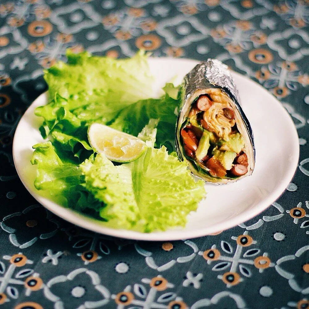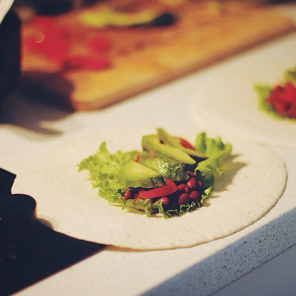 Помидоры Красная консервированная фасоль Сушеный орегано Зеленый салат Лайм Чеснок Растительное масло Тмин Соль Помидоры черри Авокадо Лук Пшеничные тортильи Закуски Мексиканская кухня Веганская еда Буррито