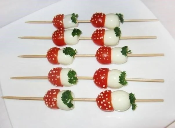 ШАГ 1 Нанизать на шпажку одно перепелиное яйцо и половинку черри (ножка и шляпка мухомора).