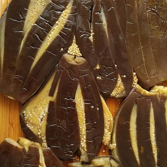 ШАГ 3 Снять пресс (на фото – баклажаны после пресса, кстати, обратите внимание, как сделаны надрезы). Отжать баклажаны руками, очистить от кожи и разорвать вдоль на волокна (должны получится длинные полоски).
