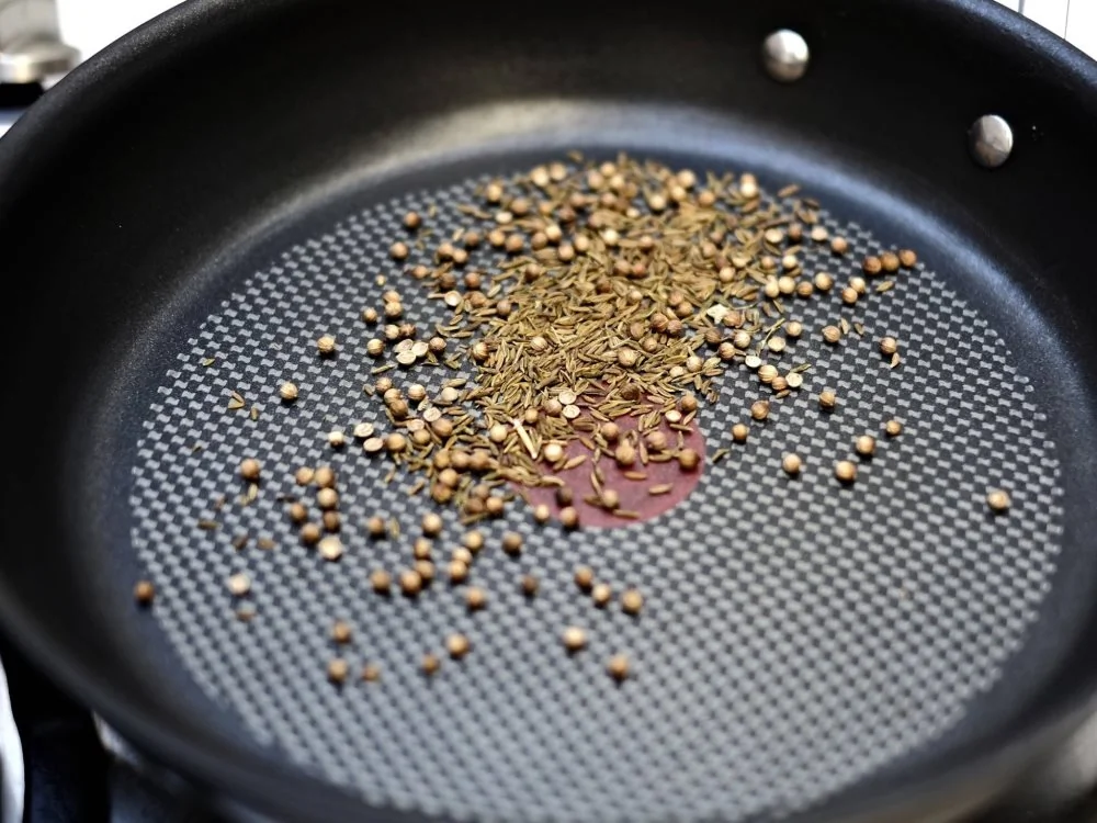 ШАГ 4 На сухой сковороде прокалите зиру и кориандр около 2 минут до появления запаха но не давай им пригореть. Растолките их в ступке со щепоткой соли