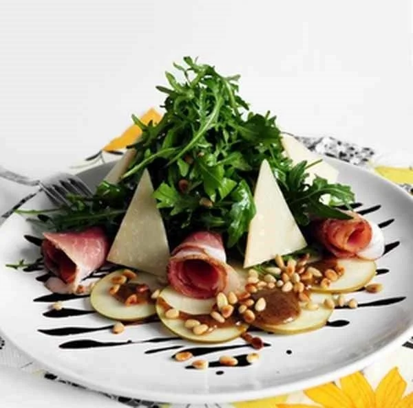 Карпаччо из груш и прошутто с рукколой и медово-горчичным соусом