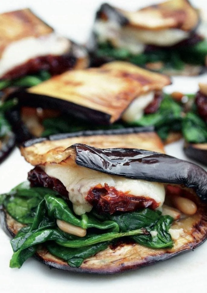ШАГ 4 Взять один ломтик баклажана, на одну его половину положить немного листьев шпината, потом кусочек вяленого помидора, посыпать сверху кедровыми орехами, слегка подрумяненными на сковороде, затем накрыть ломтиком сыра. Сложить баклажан пополам и поместить на большой противень с антипригарным покрытием. Повторить процедуру с остальными баклажанами. Посолить и поперчить.