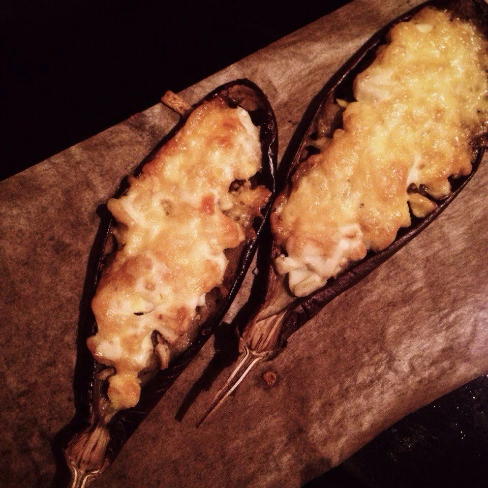 ШАГ 4 В «лодочки» выложить мякоть баклажанов, оставить около 3-4 мм по краям и на дне, затем выложить яйцо, смазать майонезом и сверху сыр.