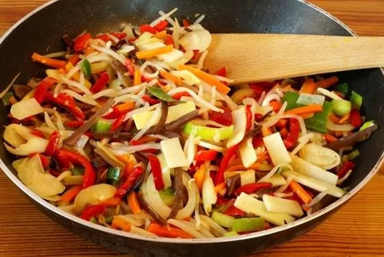 ШАГ 2 Добавьте пак-чой, обжарьте, затем добавьте 2 столовые ложки воды. Уменьшите огонь и потомите 2–3 минуты.