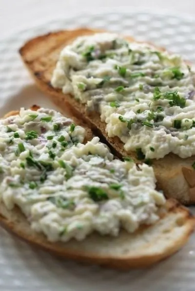 ШАГ 5 Хлеб нарезать, смазать сливочным сыром и присыпать луком.