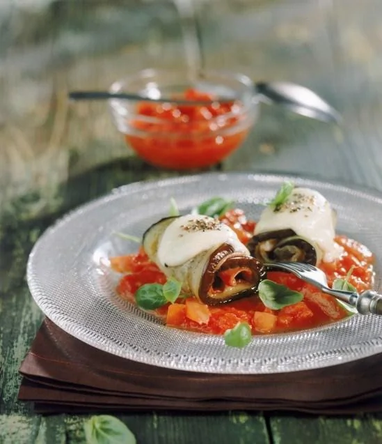 Рулеты из баклажана и моцареллы с приправой из рукколы