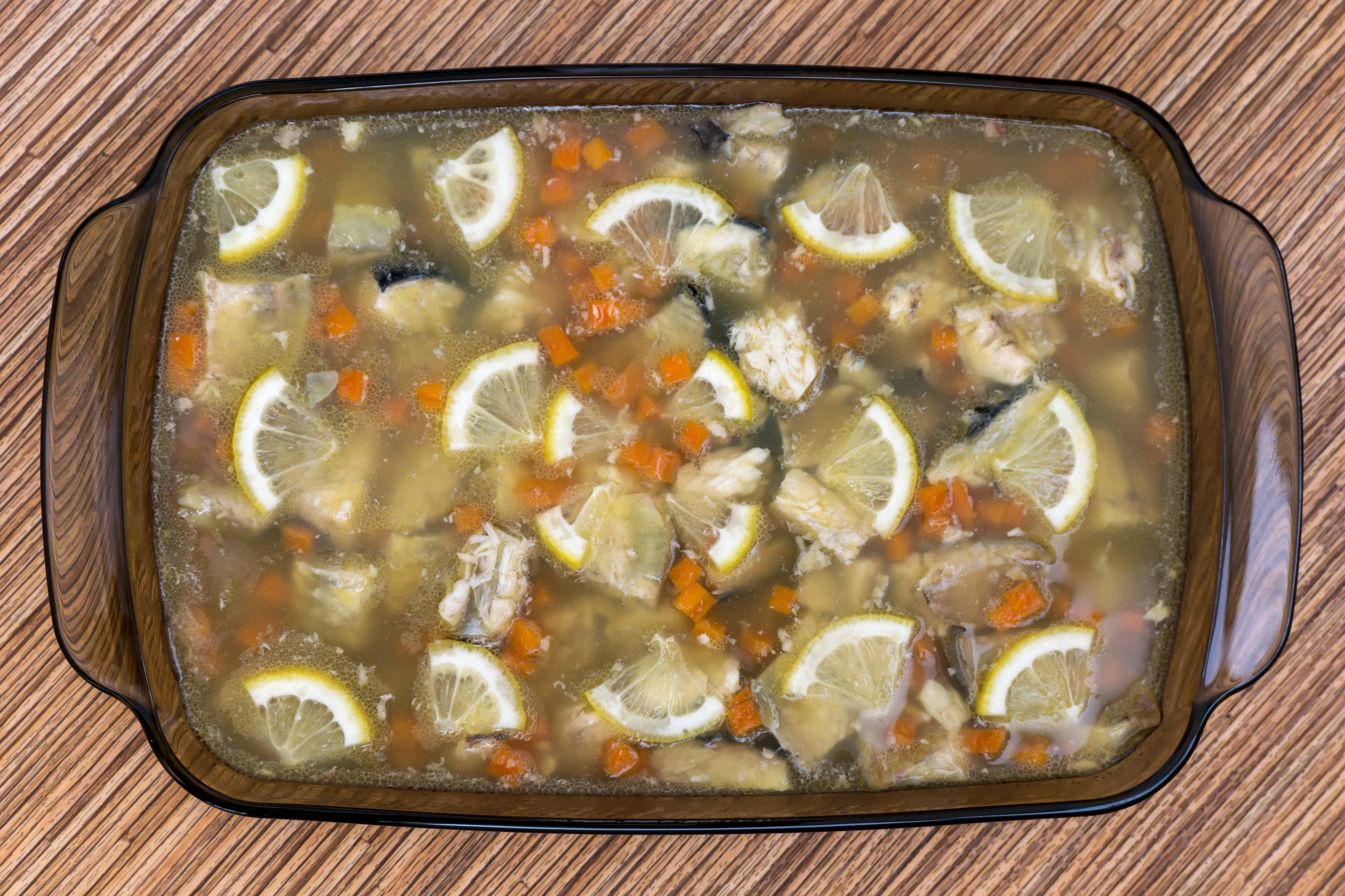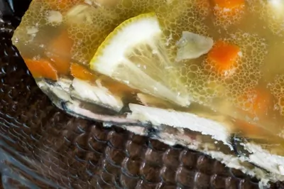 ШАГ 5 Выложить в крупном судке на дно мелочь; поверх, перекладывая морковью, крупные аккуратные куски. Аккуратно, чтобы не нарушить выкладку, влить бульон (не горячий). Распределить поверх четвертинки тонко порезанных ломтиков лимона (не обязательно). Заморозить.