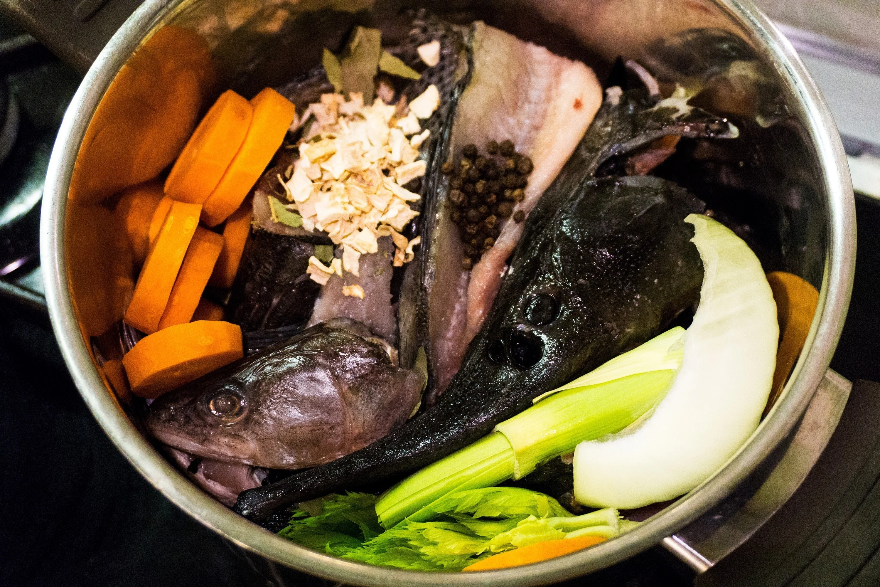 ШАГ 2 Отделив голову, хвост, плавники, поставить их вариться с луком, морковью, перцем, лаврушкой, смесью кореньев для супа (петрушка, сельдерей, пастернак) и зеленью сельдерея (мягкие части, остающиеся у стеблей; по вкусу, но не меньше 4–5 веточек) в минимальном количестве воды — так, чтобы в тесной кастрюле даже не до конца прикрывалась рыба. Варить 20 минут.