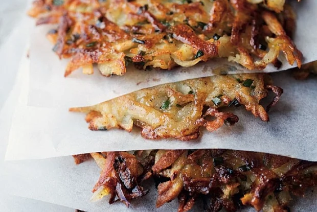 ШАГ 3 На сковороду положить половину сливочного масла, налить половину подсолнечного. Нагреть на среднем огне. Взять в руку примерно 2 ст. л. смеси для латкес, отжать, чтобы удалить лишнюю жидкость, и слепить тонкую котлетку толщиной 1 см и шириной 8 см. Осторожно опустить латкес в масло, придавить и выравнять выпуклой стороной ложки и жарить на среднем огне по 3 минуты с каждой стороны. Снаружи латкес должны полностью подрумяниться.