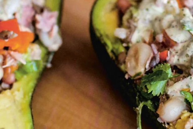 ШАГ 4 Получившийся салат выложить в половинки авокадо. Можно подавать к столу.