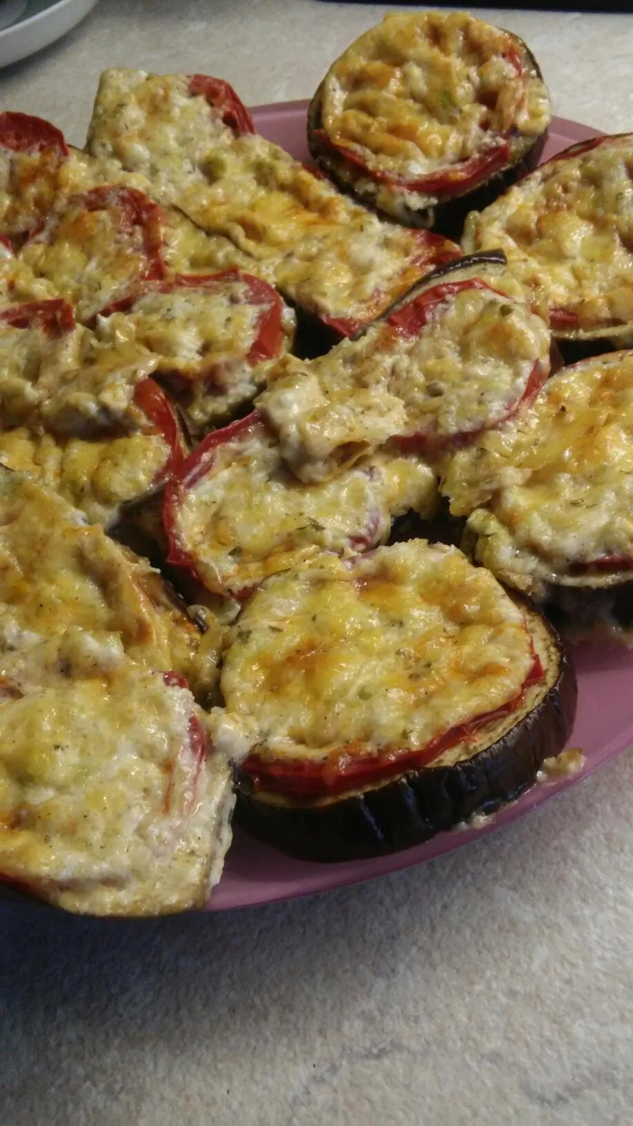 ШАГ 1 Баклажаны помыть, нарезать вдоль, приправить солью и выложить на смазанный маслом противень. Помидоры нарезать кружочками и выложить вторым слоем на баклажаны.