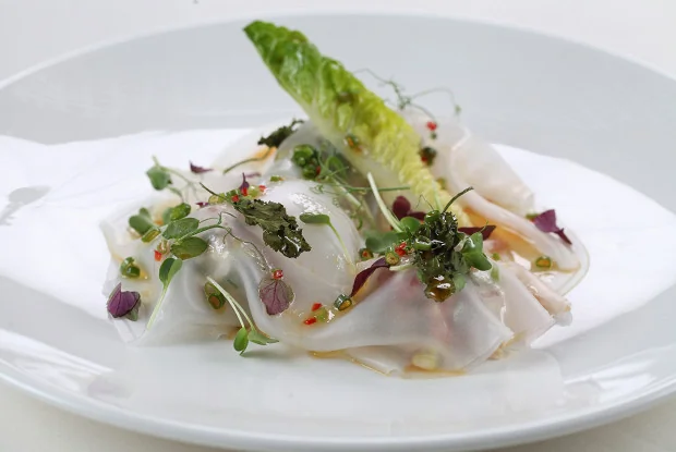 ШАГ 4 Поливаем соусом юзу и кунжутным маслом украшаем кинзой и листьями салата.