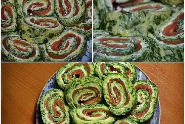 Замороженный шпинат Куриное яйцо Тертый сыр Творожный сыр Горчица Слабосоленый лосось Соль Закуски Средиземноморская кухня Рулеты