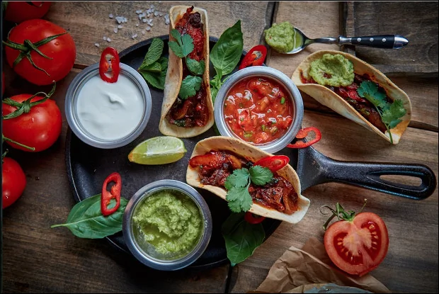 ШАГ 4 Лепешки сформировать в виде «лодочки» и поджарить в саламандре. Готовую смесь выложить в лепешки, украсить кинзой, долькой лайма и дополнительно подать сметану, томатную сальсу и гуакомоле.