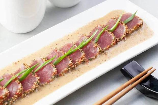 ШАГ 4 Налить соус на тарелку, сверху выложить дольки тунца в панировке. В завершение можно посыпать луком-резанцем.