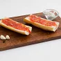 ШАГ 1 Багет нарезать на ломти длиной примерно 12 см, затем разрезать их вдоль. Отправить в духовку, разогретую до 180 градусов, на 8 минут.