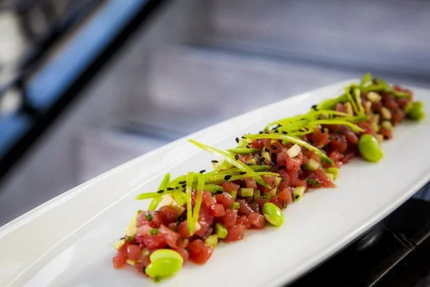 ШАГ 1 Филе лосося нарезать кубиком со стороной 5-6 мм. Соевые бобы опустить в кипяток на 10-15 секунд, откинуть на дуршлаг и опустить под струю холодной воды на 20 секунд, очистить от шкурки. На украшение оставить 1-2 стручка. Лук-резанец мелко нарезать.