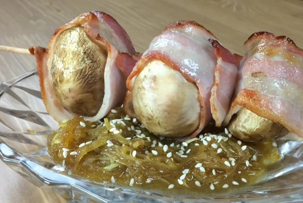 ШАГ 2 Отделить шляпки грибов от ножек. Обернуть шляпки в бекон и нанизывать на шпажки по 3 штуки, посолить по вкусу. Положить шпажки с грибами на форму для запекания с кабачками и отправить в разогретую до 180°С духовку на 10 минут, сок с грибов и бекона будет стекать на кабачки при запекании, что придаст им дополнительный вкус и сделает блюдо целостным.