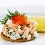 ШАГ 3 Выложить полученную смесь на обжаренные ломтики хлеба. Сверху на каждый тост положить несколько креветок и по ложечке икры. Украсить веточкой укропа и долькой лимона.