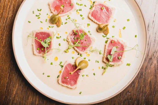 ШАГ 3 В тарелку выложить готовый соус, нарезать кусочками тунец примерно по 0,5 см и аккуратно распредилить по тарелке на соус, каперсы надрезать на две части, чтоб держались на веточке и украсить блюдо, сверху посыпать рубленным луком-резанец.
