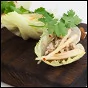 ШАГ 5 Смешать курицу с соусом, затем выложить в листья айсберга и украсить веточкой кинзы, рубленным миндалем и яблоком.