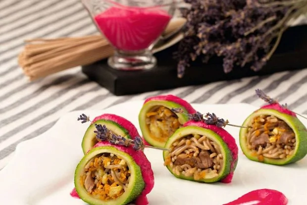 Цукини, фаршированные лапшой соба с говядиной под свекольным соусом