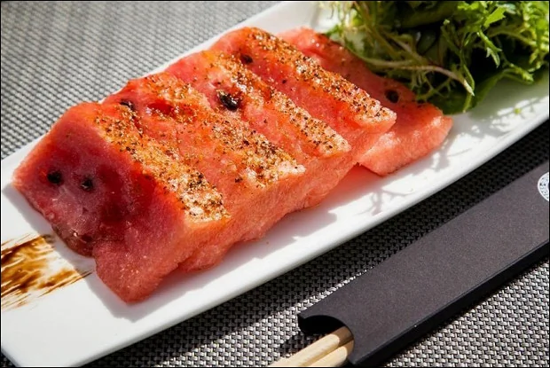 ШАГ 3 Холодный арбуз нарезать на ломтики, высыпать на ломтики карамель тонким слоем (1-2 мм). Опалить горелкой до появления небольшой корочки светло-коричневого цвета (5-10 секунд). Выложить на тарелку салатные листья и ломтики опаленного арбуза с карамелью.