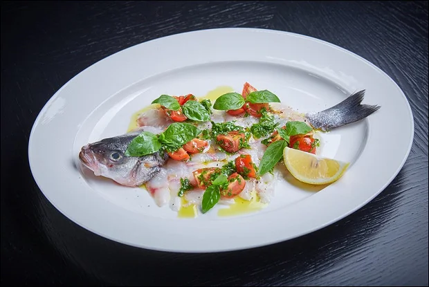 ШАГ 1 Филе охлажденного океанского сибаса нарезать тонкими слайсами под углом 70 градусов поперек волокон.