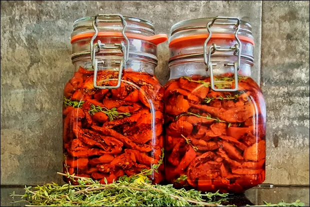 ШАГ 7 На дно банки положить 2 половинки чеснока, 2 веточки тимьяна, и 1/3 вяленых томатов, так повторить еще 2 раза, верхним слоем будут томаты.