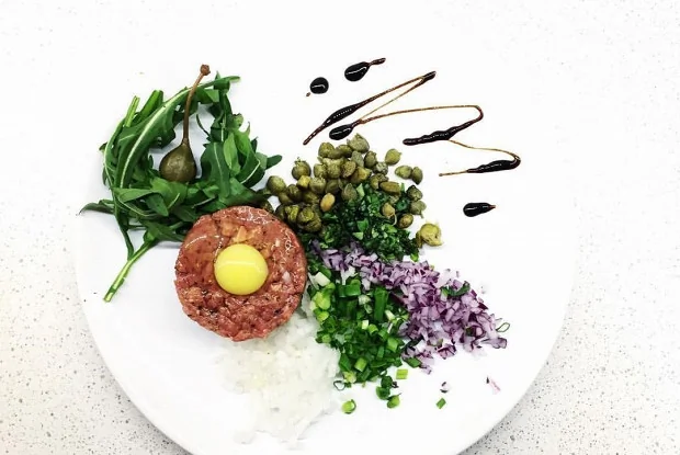 Сегодня пятница, и мы с подругой договорились пойти в бар где нууу ооооочень вкусно готовят тар тар из говядины. Но последнее время я ленивая отчаянная домохозяйка, мне безумно уютно в своем доме и не очень-то хочется в осень выходить. Поэтому я рискнула предложить ей приехать ко мне в гости с заявлением, что вино с нее. Она очень рассчитывала на тар тар и я не могла лишить ее этого удовольствия. Поэтому по пути домой я заехала на рынок в поисках лучшего мяса! Выбор говядины для тар тара — дело очень ответственное. Ведь предстоит есть в сыром виде. Поэтому выбираю: по цвету, запаху, на ощупь. Цвет говядины красный. Но то, что вы видите в супермаркетах зачастую подкрашено и освещено красными лампами. Поэтому выбираем исключительно говяжью вырезку, исключительно вкусно пахнущую (это значит, если вас смущает запах, не берите, должно пахнуть молоком), если ткнуть пальцем то вмятинка должна вернуться в обратное состояние. Цвет розовее, чем у свинины. У свинины все же запах неприятный. Приехав домой, открыла бутылочку белого сухого. Под мясо конечно полагается красное сухое, но я обхожу эти правила. ну не люблю я красное вино! Я люблю готовить долго, я уже кажется об этом писала, так вот, лучше бы я не готовила долго! Освобождать мясо от прожилок это ооочень муторное дело! но оно того стоит! ПРиехала моя Кейт, я специально спрятала мясо, чтобы она поиграла немного в угадайку, что же она будет есть к сегодняшнему винчику: — каперсы, лук, соус......О! Боже!!!!!! Даша!!!!!! Это ТАР таР!!!!!!!!!!!!! — Ну конечно!!! как же я могла оставить тебя без того чего ты так желала сегодня.....