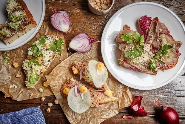 ШАГ 2 Выложить на хлеб тунец, сделать салат из черной редьки — натереть на терке, смешать с медом, маслом и солью.