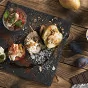 ШАГ 5 Яблоко полить медом и украсить жареными семечками, нектарин посыпать миндальными лепестками и паприкой. На грушу выложить карамелизованную сливу, украсить миндальными лепестками и стружкой белого шоколада. Клубнику украсить стружкой темного шоколада и листиками мяты.