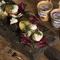 ШАГ 2 Готовые овощи располовинить и выложить на доску для подачи. У радиккьо оторвать пару красивых листьев и выложить их к овощам. Выложить на картофель Альметте с белыми грибами, на репу — Альметте с зеленью, на свеклу — Альметте с чесноком, на радиккьо — Альметте с томатами.