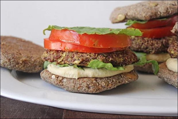 ШАГ 8 Осталось собрать бургер! На нижнюю булочку можно намазать хумус, сверху положить листья салата, затем котлету и ломтики помидоров.