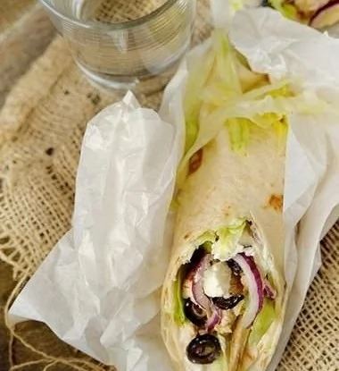 ШАГ 7 Лист лаваша намазываем смесью, сверху кладем нарезанный салат, куриное филе, лук, сыр фета и маслины и все это заворачиваем в виде рулета.