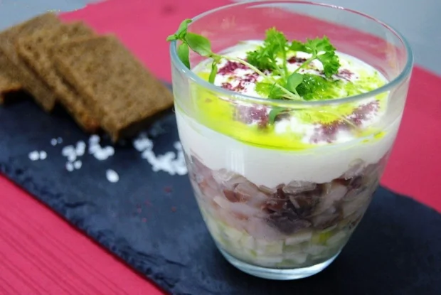 ШАГ 1 Всё очень мелким кубиком нашинковать и уложить слоями в стакан-тумблер (огурец-сельдь-лук).