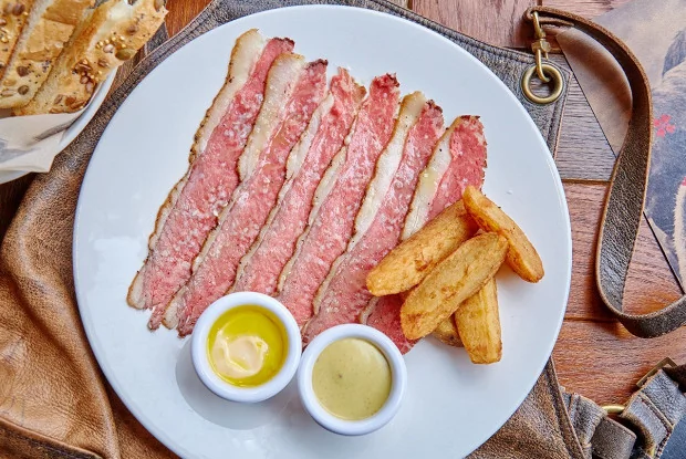 ШАГ 6 Готовое мясо разрезать на тонкие ломтики и выложить на тарелку, сверху по вкусу добавить розмариновую соль. Подавать с картофельными дольками и двумя видами соуса.