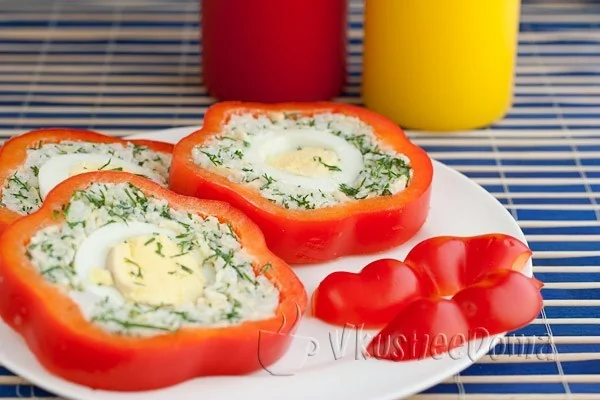 Свежий сладкий перец, фаршированный рисом, яйцом, сыром и зеленью