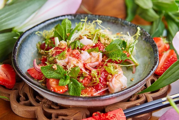ШАГ 2 Клубнику, красный лук и креветки нарезать и смешать с листьями свежей мяты и рыбным соусом (рыбная вытяжка и сок лимона).