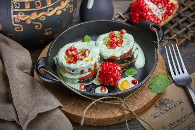 ШАГ 7 Готовое блюдо полить по краям соусом и украсить зернами граната.