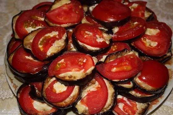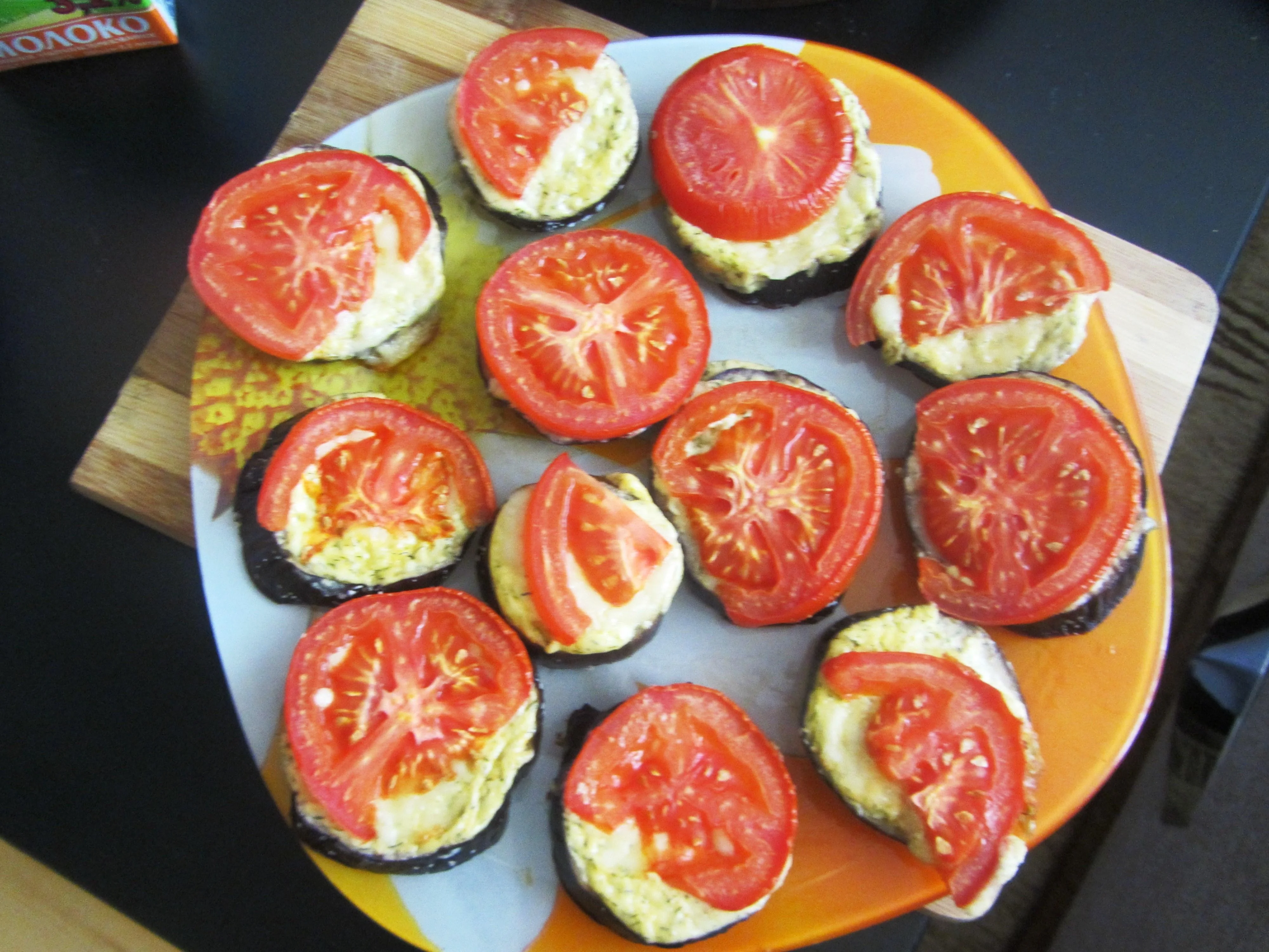 ШАГ 5 Режем кружочками помидоры. И кружочком помидора накрываем баклажан сверху сырного прямоугольника.