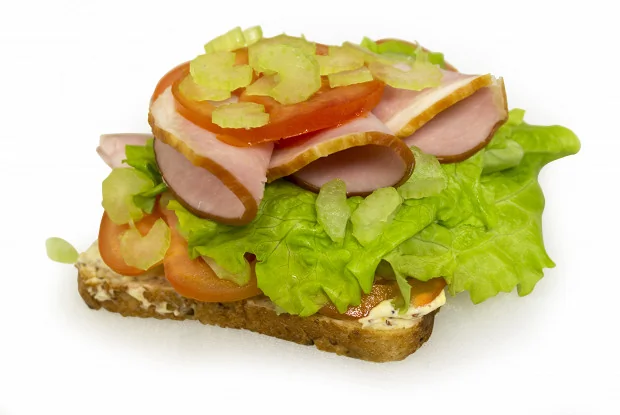 Выложить второй слой карбоната, сельдерея и помидор. Ваш смёрребрёд, готов.