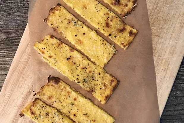 ШАГ 6 При помощи острого ножа нарезать поленту тонкими брусками (см фото). Смазать оливковым маслом, посыпать прованскими травами и оставшимся пармезаном.
